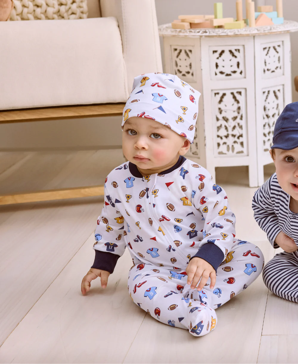 Your baby will be ready for game day in our football fever zippered footie. Made from the softest Pima cotton for ultimate comfort.